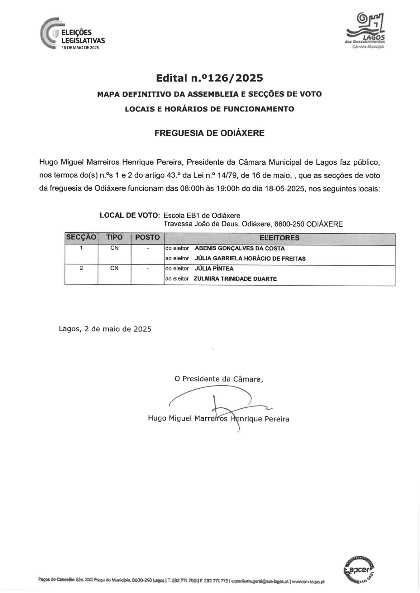 Edital n.º126/2025 - Mapa definitivo da Assembleia e Secções de Voto -...