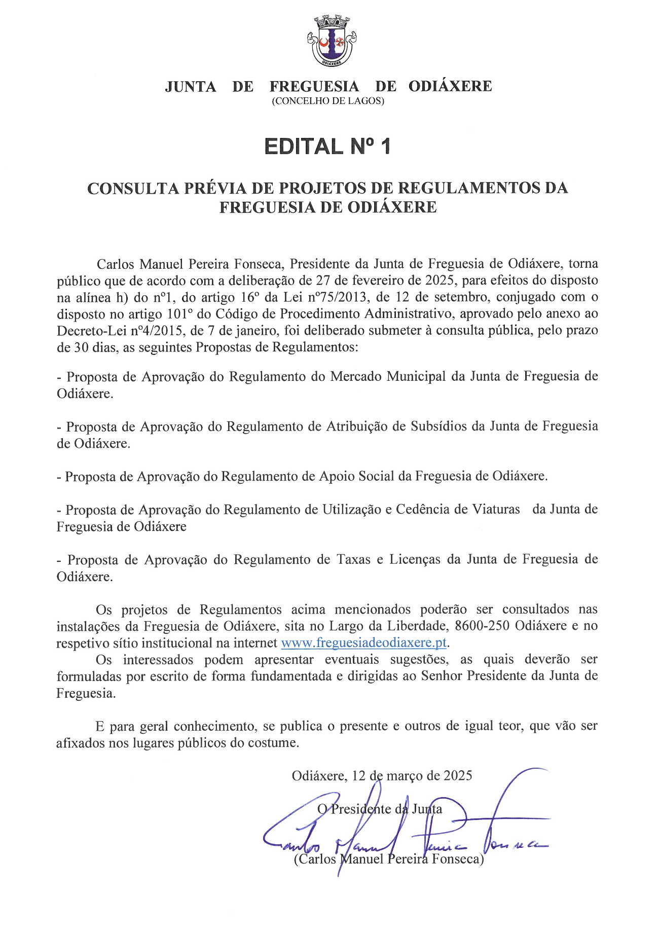 Edital n.º 1 - Consulta Prévia de Projetos de Regulamentos da Freguesia...